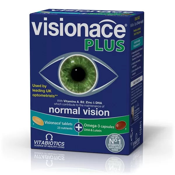 Το Visionace Plus της Vitabiotics αποτελεί μια διπλή συσκευασία που περιλαμβάνει τις ταμπλέτες Visionace μαζί με κάψουλες με ωμέγα-3 λιπαρά οξέα και έξτρα εστέρες λουτεΐνης.