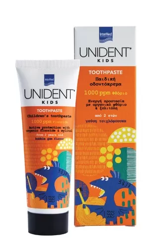 H Unident kids toothpaste είναι ειδικά σχεδιασμένη φθοριούχος οδοντόπαστα για την καθημερινή προστασία και την ενδυνάμωση των ευαίσθητων παιδικών δοντιών. Με φθόριο από οργανικά μόρια, για καλύτερη απορρόφηση σε σχέση με αντίστοιχες ανόργανες ενώσεις, προσφέρει αποτελεσματική και μεγάλης διάρκειας προστασία από την τερηδόνα. Η ξυλιτόλη, ένα φυσικό γλυκαντικό, προστατεύει καθημερινά τα δόντια από τα οξέα που προκαλούν τερηδόνα και προλαμβάνει τον σχηματισμό της μικροβιακής πλάκας