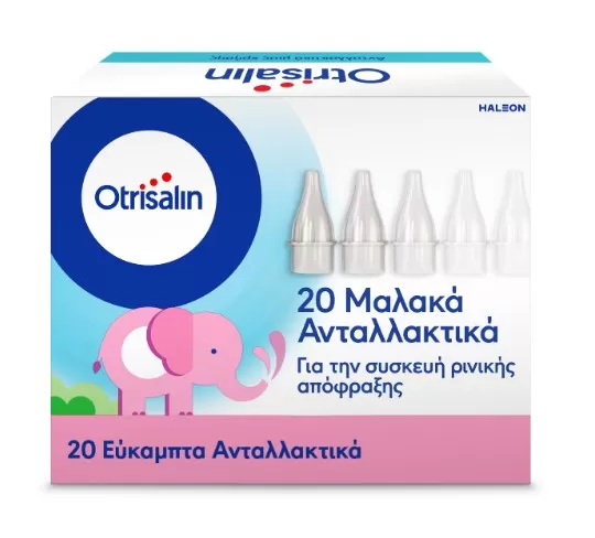 Η συκευασία ανταλλακτικών Otrisalin περιέχει 20 εύκαμπτα ανταλλακτικά ακροφύσια μιας χρήσης με απορροφητικό φίλτρο που χρησιμοποιούνται με τη Συσκευή Ρινικής Απόφραξης Otrisalin για μωρά (η συσκευή ρινικής απόφραξης πωλείται ξεχωριστά).
